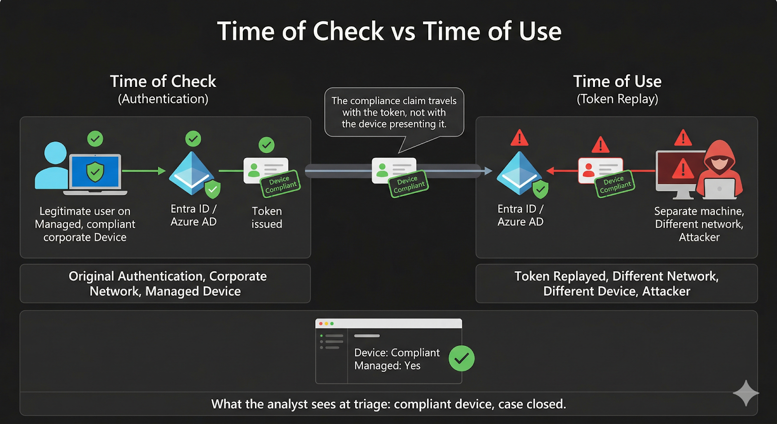 This is a structural limitation of how device compliance is evaluated at triage time. The compliance check answers the question “was the original device managed?” It does not answer the question “is the entity using this token right now the same entity that authenticated on that device?” Those are very different questions, and the gap between them is exactly where session hijacking lives.