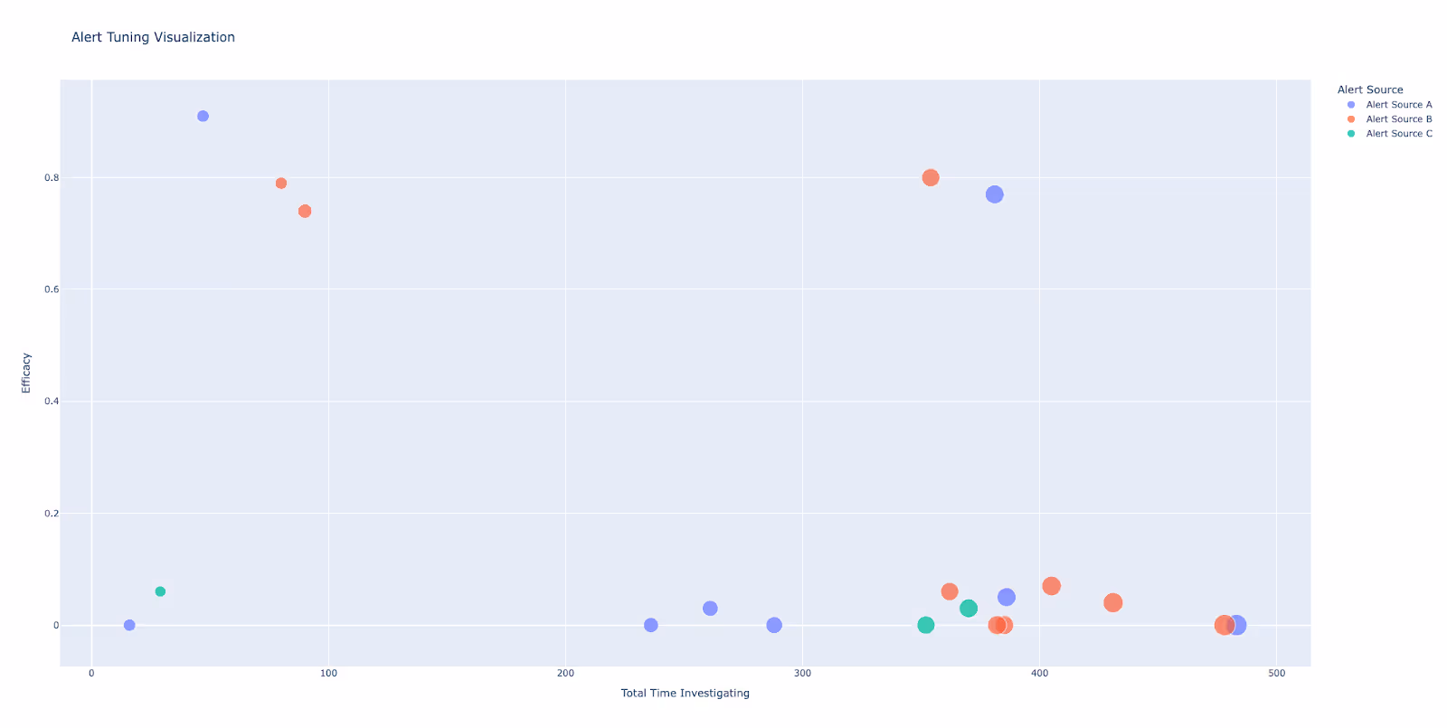 Prioritize with a simple chart: plot efficacy on the Y axis, total time investigated on the X axis, and size points by alert count. See the below figure as an example. The lower right quadrant highlights the most impactful false positive tuning targets. Items on the left often suit light automation.